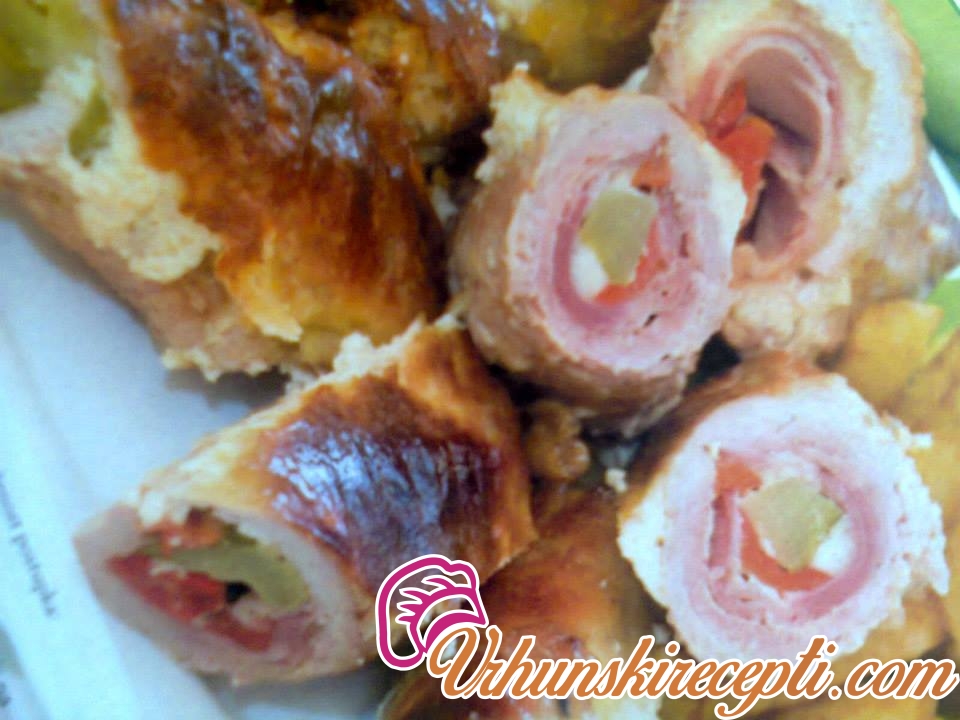 Svaku šniclu tanko premazati senfom, staviti po malo rendanog kačkavalja, staviti po 2 lista suvog vrata i nekoliko štapića krastavca i paprike. Uviti kao sarmu, samo duže, i uvezati kuhinjskim koncem. Propržiti na vrelom ulju, pa zaliti sa 3 dl juneće supe i dinstati na tihoj vatri dok tečnost ne ispari. Umutiti 2 žumanca sa 2 dl kisele pavlake i malo začina, dodati 40 g rendanog parmezana.